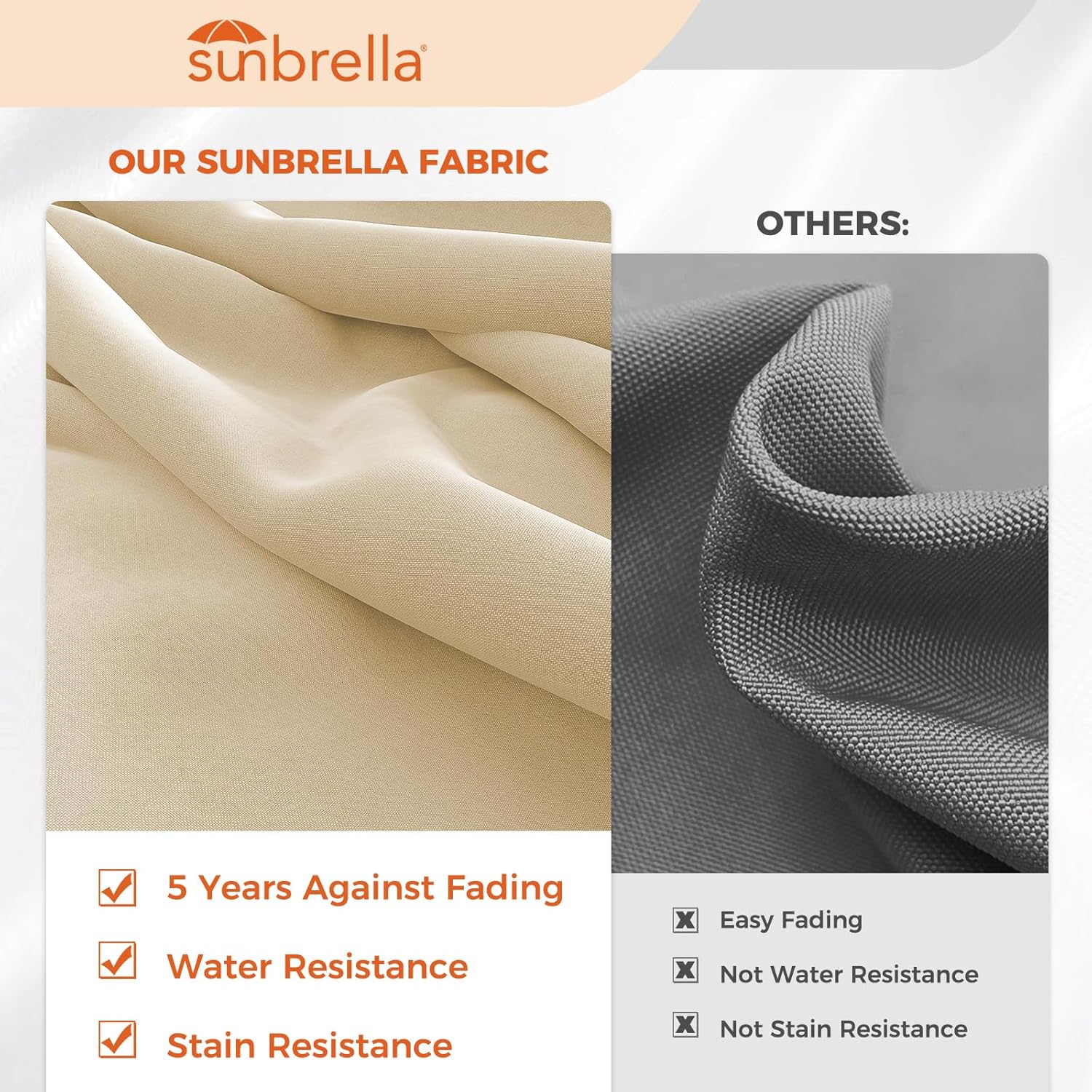 - SUNBRELLA FABRIC: Premium quality umbrella canopy made from industry-leading Sunbrella fabric, 270-gram breathable outdoor fabric, 100% solution-dyed acrylic, 5 years fade-resistance, water and stain resistance, added sun protection against skin damage